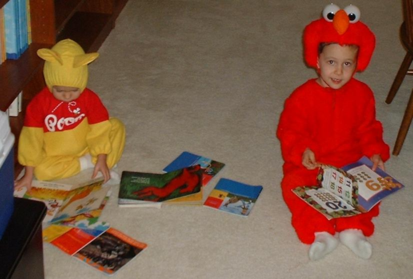 Winnie the Pooh and Elmo reading books.