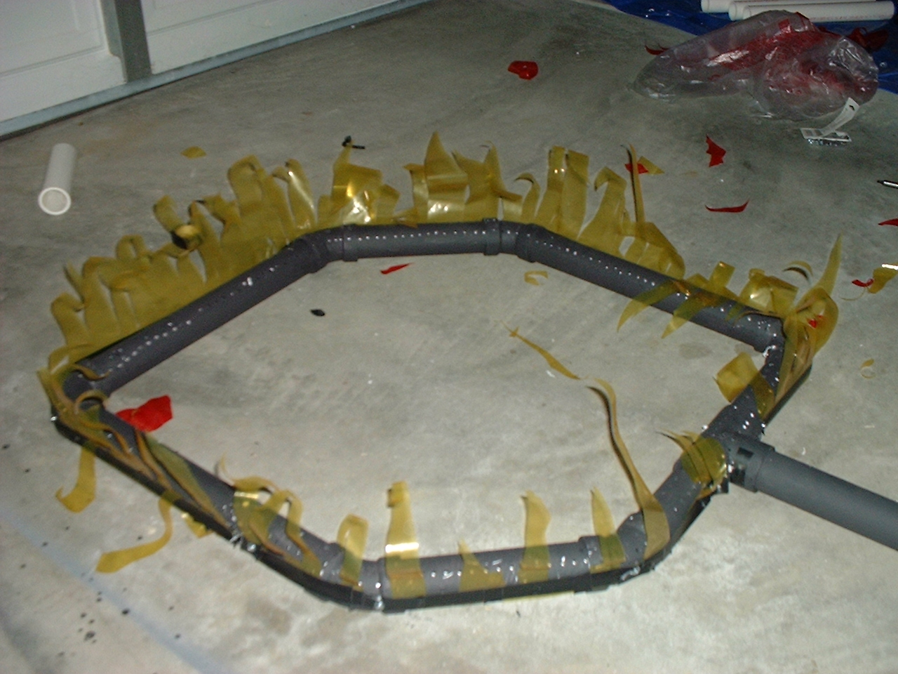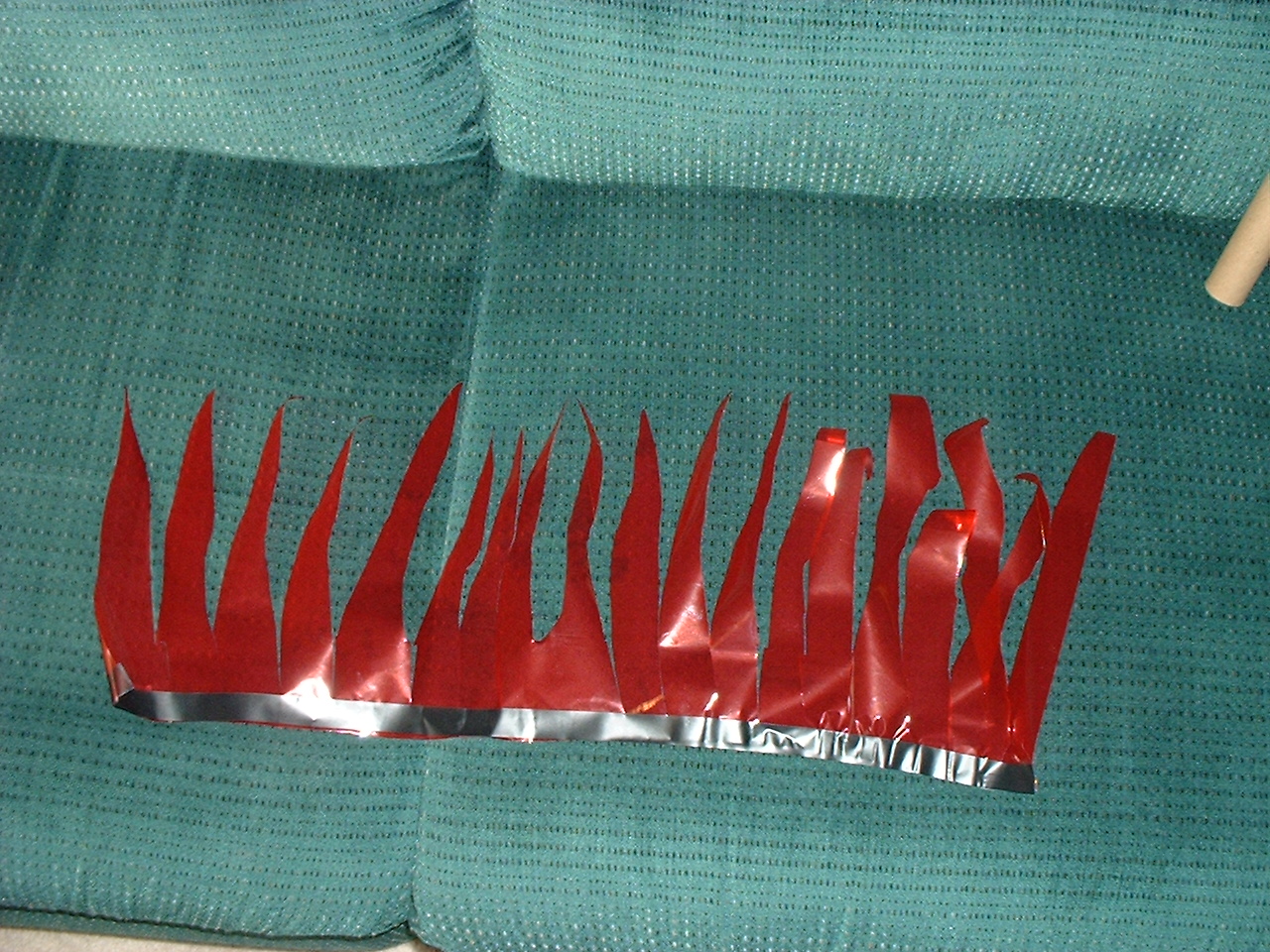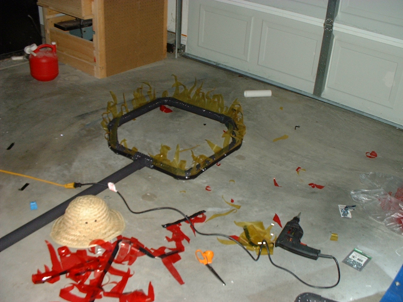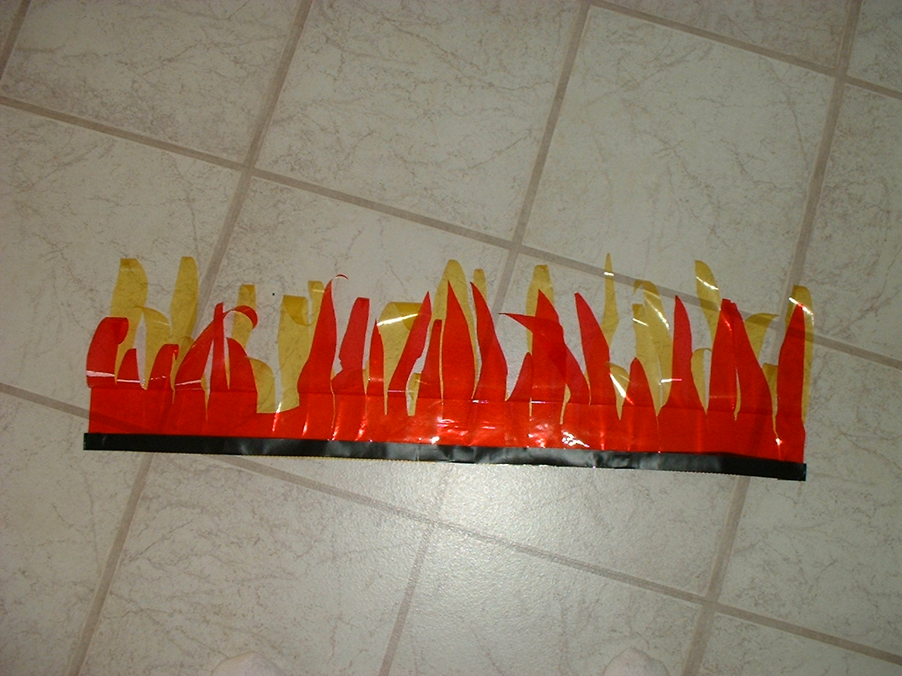 Cauldron with Cellophane FlamesThese were inspired by the 'burning town' scene at the Pirates of the Caribbean ride at Disneyland. I built a PVC frame to deliver air from my shop-vac to the cellophane cutout flames to make them dance. Coupled with a string of orange lights placed under the cauldron, the effect was quite realistic when viewed from 10 feet away.