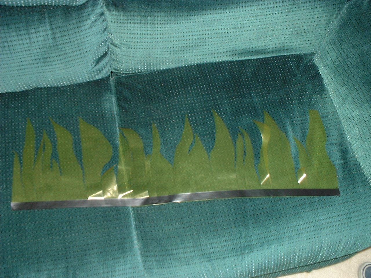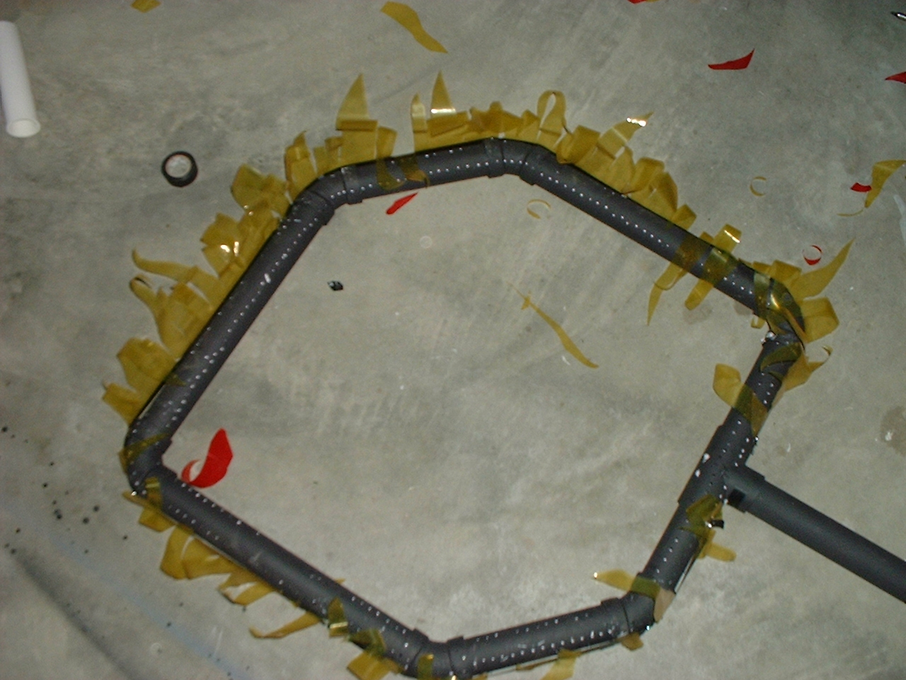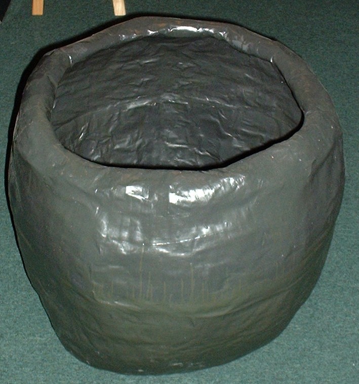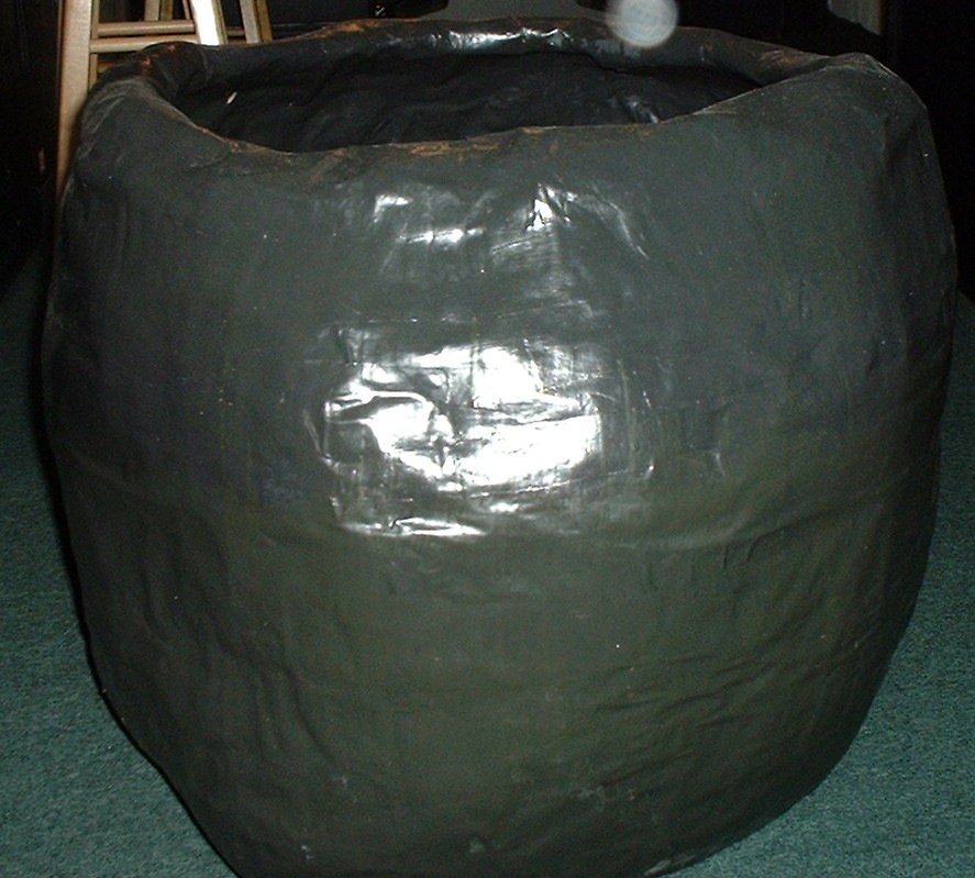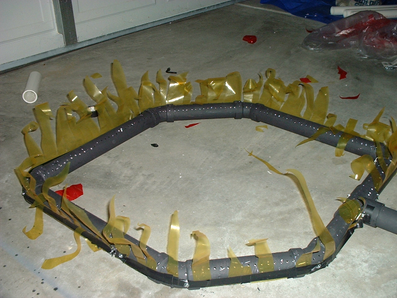Cauldron with Cellophane FlamesThese were inspired by the 'burning town' scene at the Pirates of the Caribbean ride at Disneyland. I built a PVC frame to deliver air from my shop-vac to the cellophane cutout flames to make them dance. Coupled with a string of orange lights placed under the cauldron, the effect was quite realistic when viewed from 10 feet away.