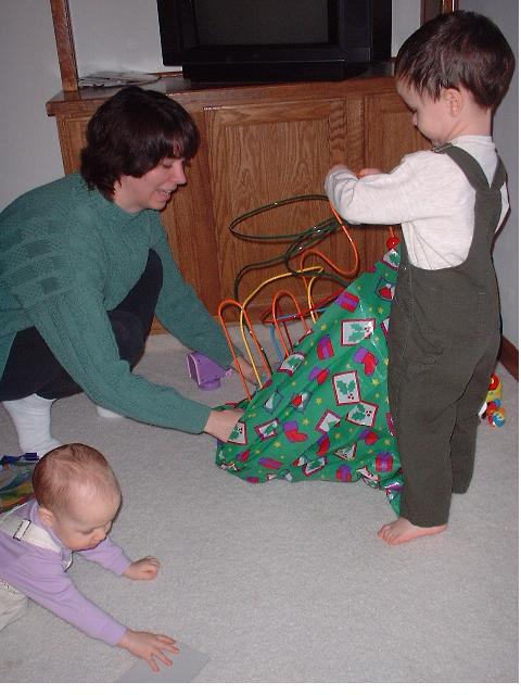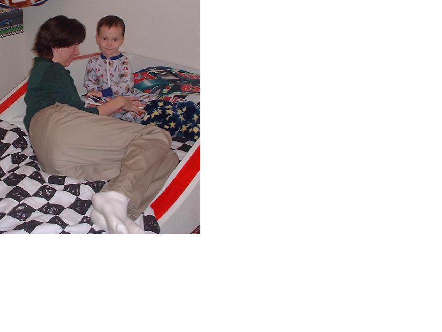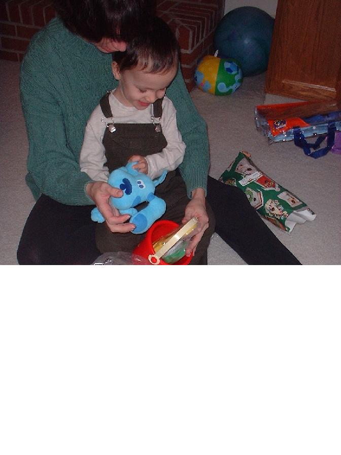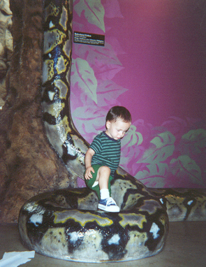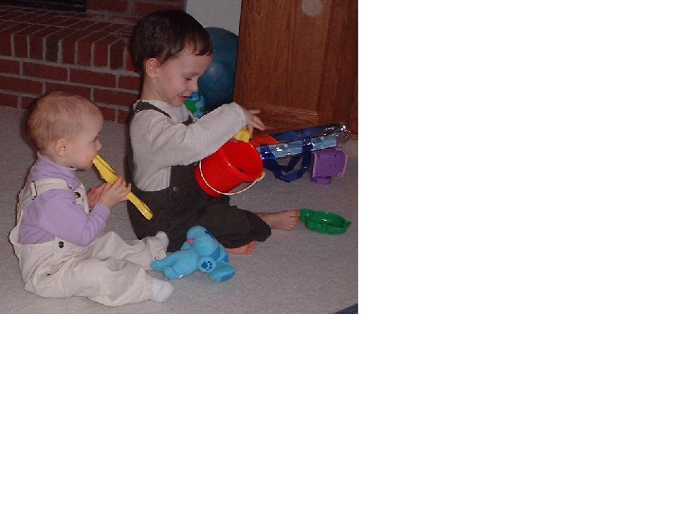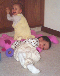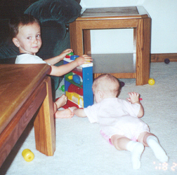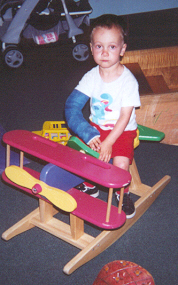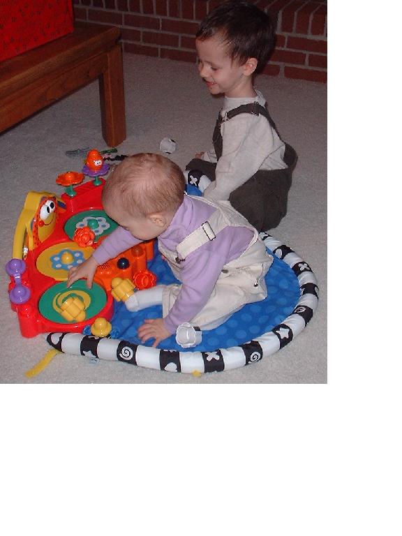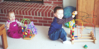 He was getting along much better with his sister. He loved to be her clown, usually by getting into trouble running on the couch. (After one broken arm, that was the end of that!) When Mom kicked him off the couch, he tried to get Melissa to chase him around the room. On the other hand, he didn't want to share his toys with her, and pushed on her like he pushed on the cat.