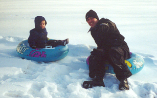 Sledding with Daddy in the backyard.