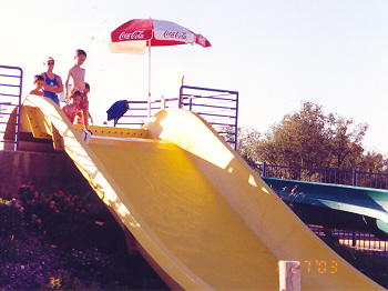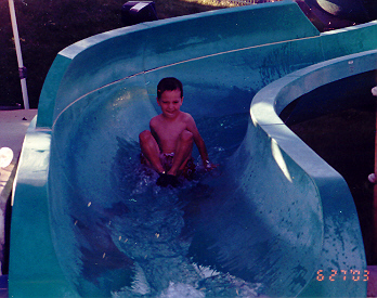 Coming down the curvy slide at the water park.