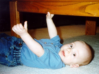 Aaron had his two bottom teeth, and appeared to be teething again. He was an expert when it came to eating solid foods. (Thanks again, Aunt Leslie!) He could sit up without help, and could push up until his arms were fully extended. The back legs didn't quite do what he wanted, so he wasn't crawling yet. He was mastering the art of opening the living room cabinets, so the childproofing began!