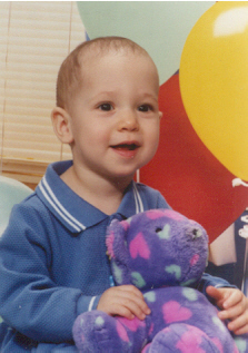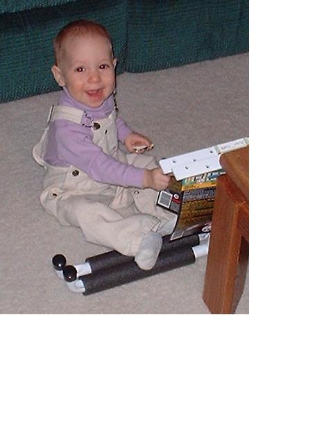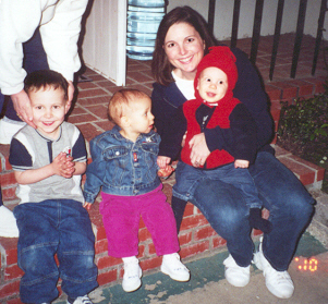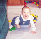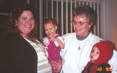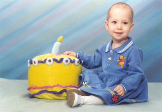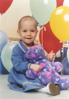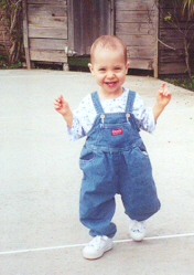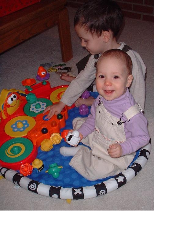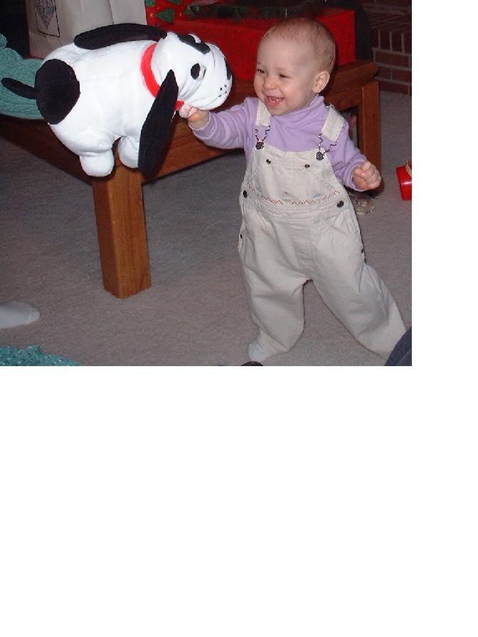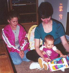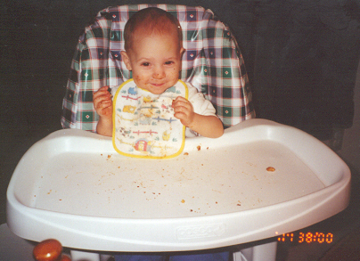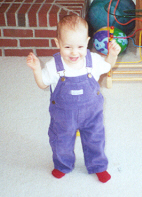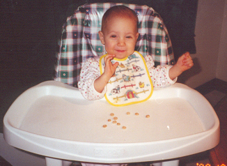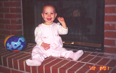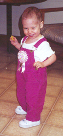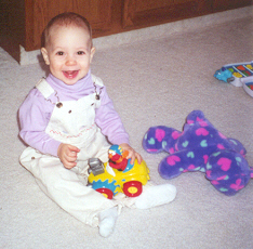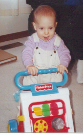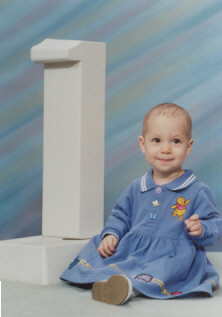 Melissa at the magical age of 1. She was working on chunkier foods, and proved it by eating anything you would give her. She was (and still is) a MOOCH!. She could walk by herself, but still stumbled alot, which is why age 1 could also be called the "Black and Blue" age. She had 8 teeth (4 on top and 4 on bottom). Following in her brother's footsteps, she had taken a liking to Face on Nick Jr. She could also say "all done" and "bye."