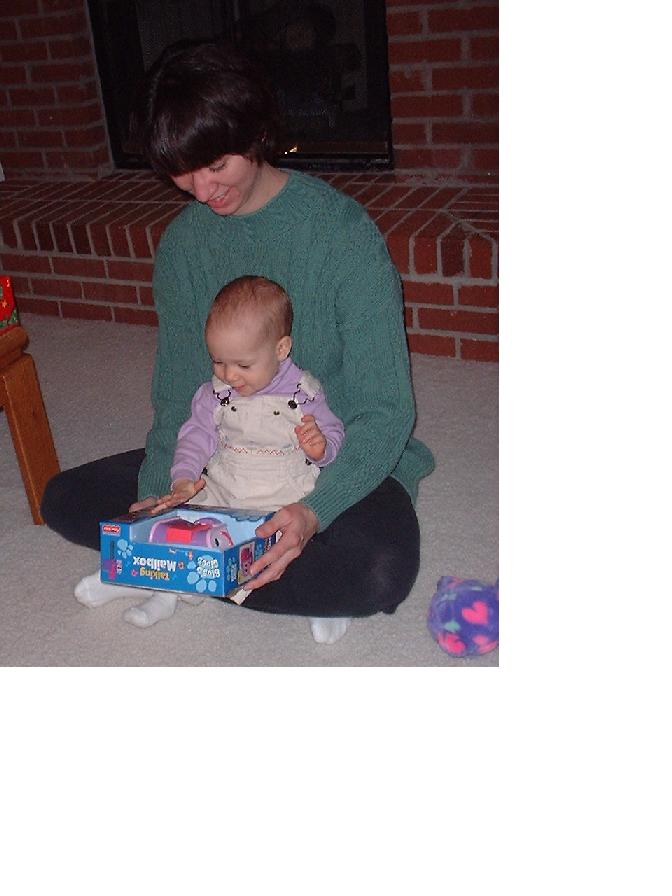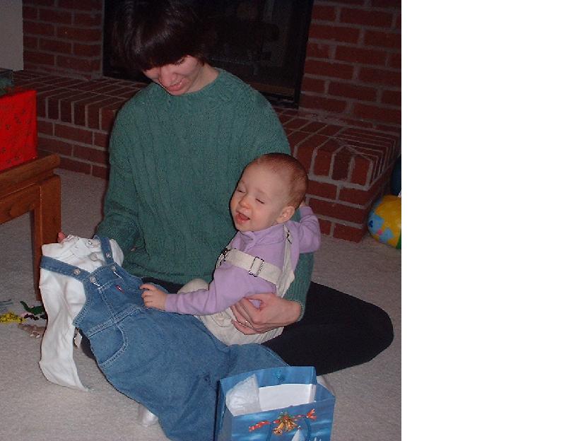 Opening her new overalls from Uncle Bill, Aunt Amy and cousin Jack on Christmas day.