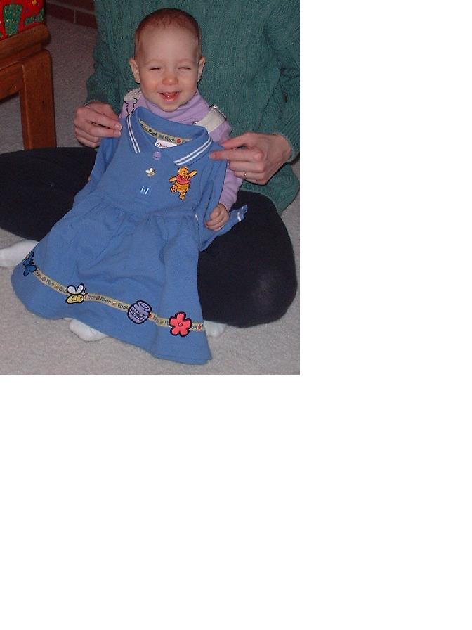 Opening her new Pooh dress from Uncle BJ and Aunt Karen on Christmas day.
